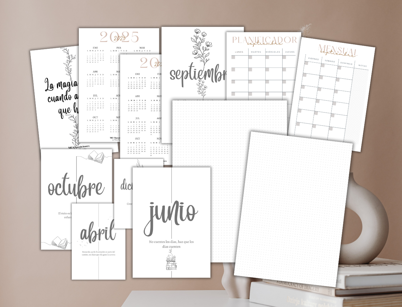 Cada mes tiene 15 páginas tipo bullet journal para poder escribir, además de los planificadores mensuales y portadas de cada mes.